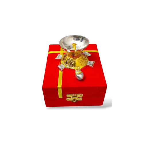 Handicraft Decorative Gold-Silver Tortoise Diya with Red Velvet Gift Box | Brass Akhand Deepam for Pooja, Temple, Diwali, Vastu Good Luck | Wedding Favour & Return Gift