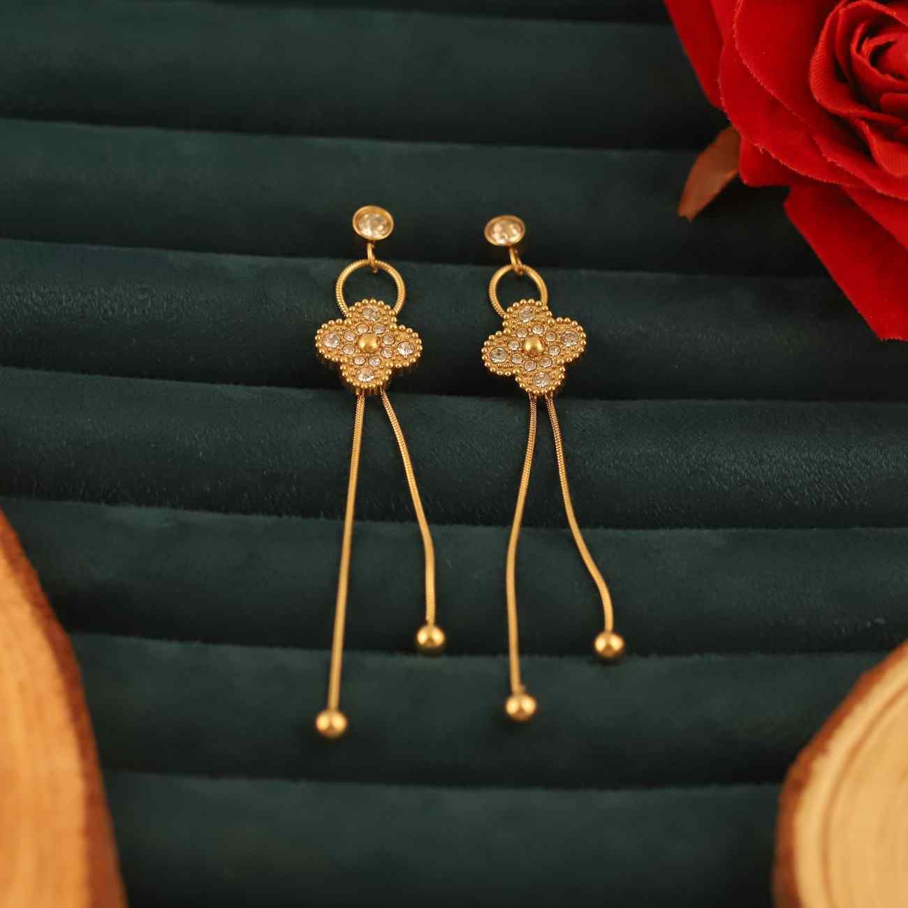 These Elegant Gold-Plated Floral Long Drop Earrings are designed to bring a touch of sophistication and grace to your look. Crafted with a stunning floral centerpiece adorned with sparkling crystals, these earrings radiate timeless charm. The sleek dual long drop chains with ball tips add a contemporary twist, making them a versatile accessory for both traditional and modern outfits. Lightweight and comfortable, they are perfect for parties, weddings, festive occasions, or even as a statement piece with casual wear. A must-have addition to your jewelry collection, these earrings beautifully balance elegance and trend.