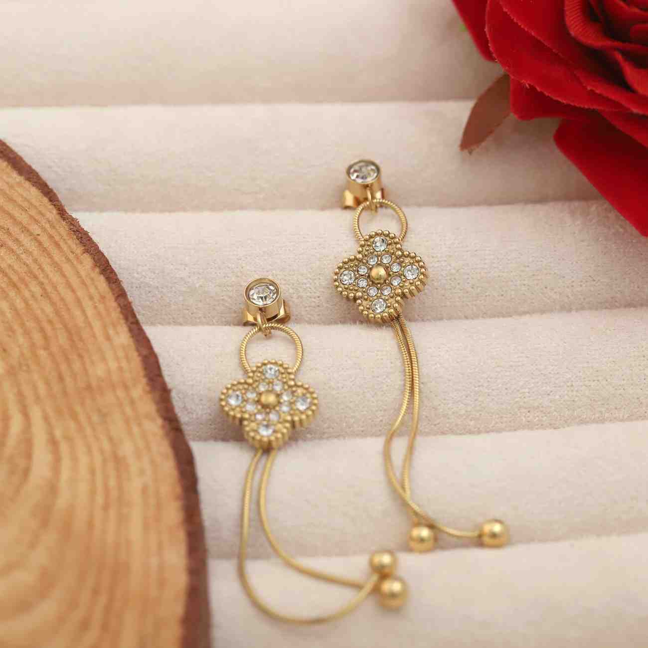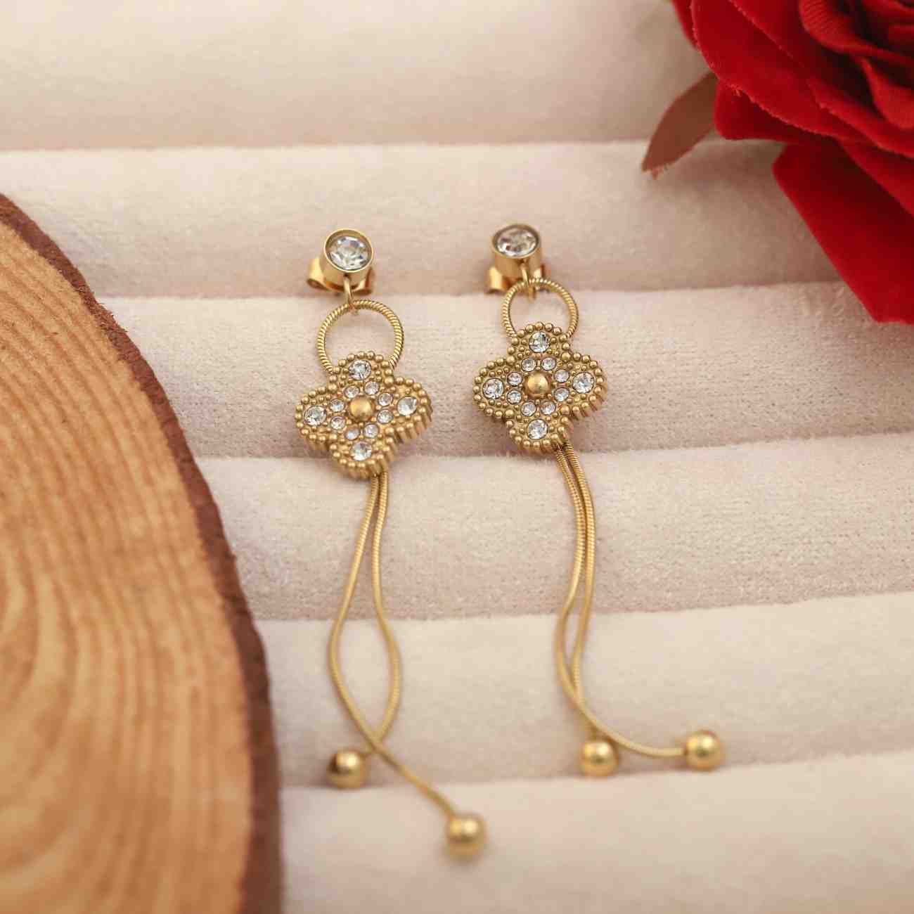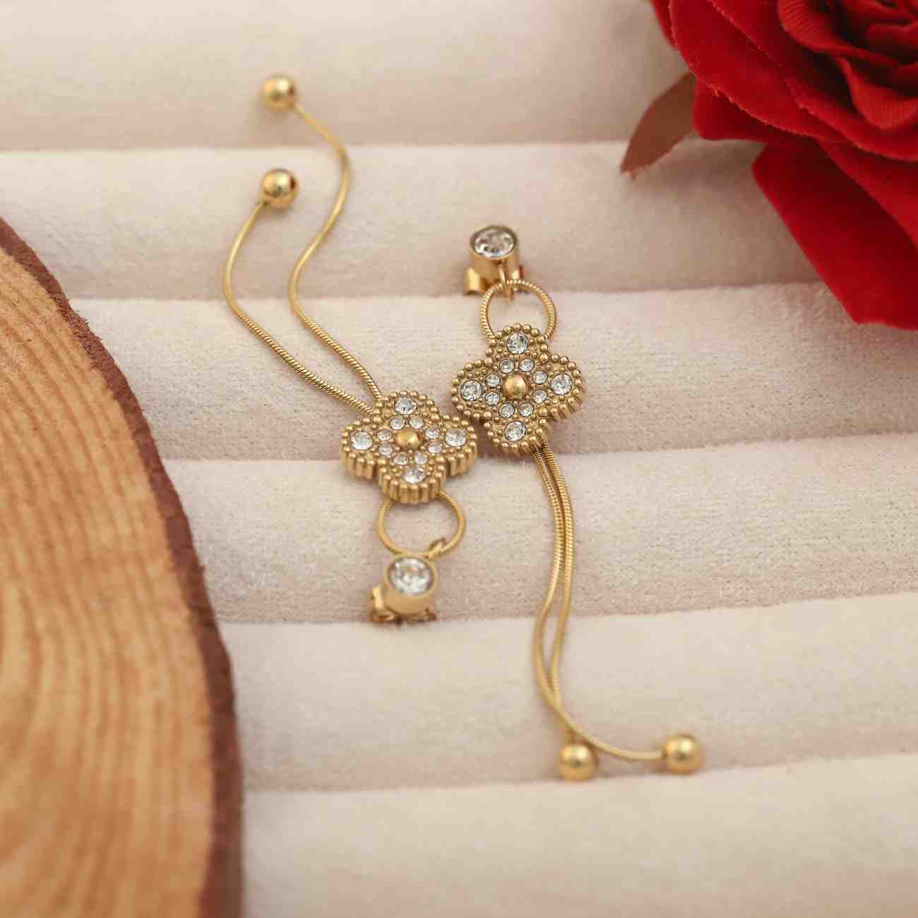 Stylish gold-plated floral earrings featuring a delicate flower motif with crystal accents and sleek long drop chains, perfect for adding elegance to any outfit.