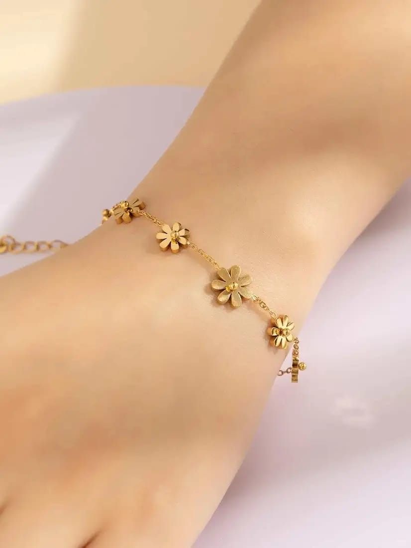 Elevate your style with this elegant 22K gold plated flower chain bracelet, a perfect blend of durability, beauty, and timeless charm. Designed with delicate daisy-shaped flowers linked gracefully along a fine chain, this bracelet symbolizes elegance, positivity, and sophistication. Crafted from high-quality stainless steel, it offers strength and resilience, ensuring long-lasting wear without losing its shine. The premium 22K gold plating enhances its rich appearance, making it a versatile accessory for both everyday wear and special occasions.