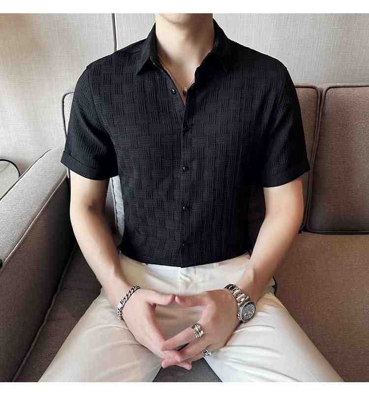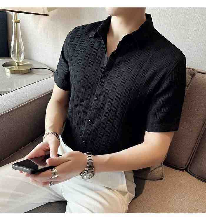 Sophisticated black short sleeve shirt with a subtle textured pattern, slim fit design, and button-down closure. Perfect for smart-casual and evening wear.