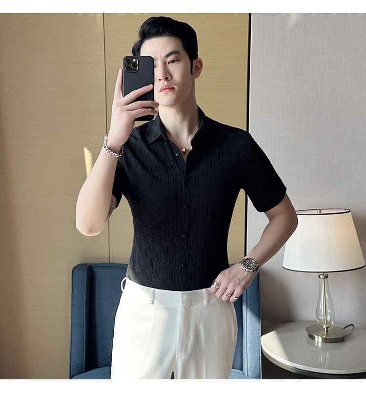 The short sleeves and lightweight material make it perfect for warm weather, while the button-down front and classic collar give it a refined touch. Ideal for dinner dates, parties, or upscale casual outings, this shirt pairs effortlessly with trousers, chinos, or even jeans.