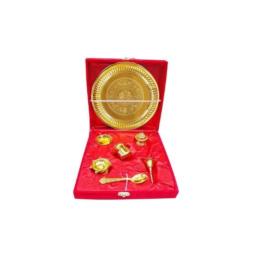 Elegant Gift Set: This 7-piece gold-plated Pooja Thali set is an exquisite traditional Indian gift, perfect for special occasions.