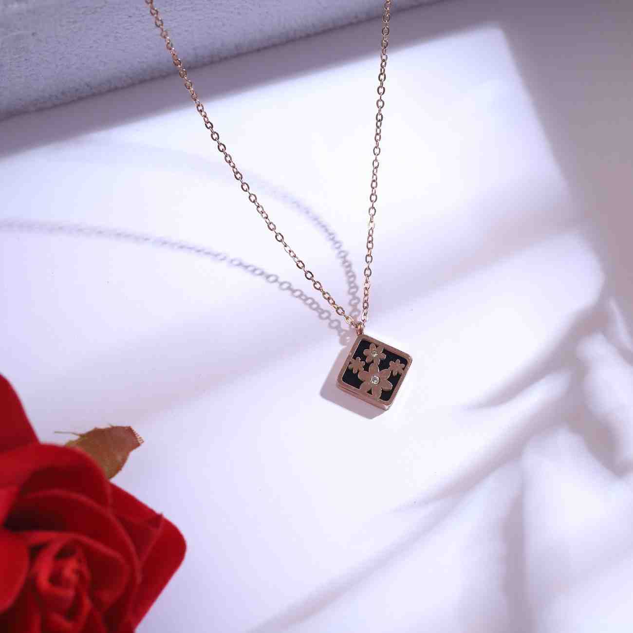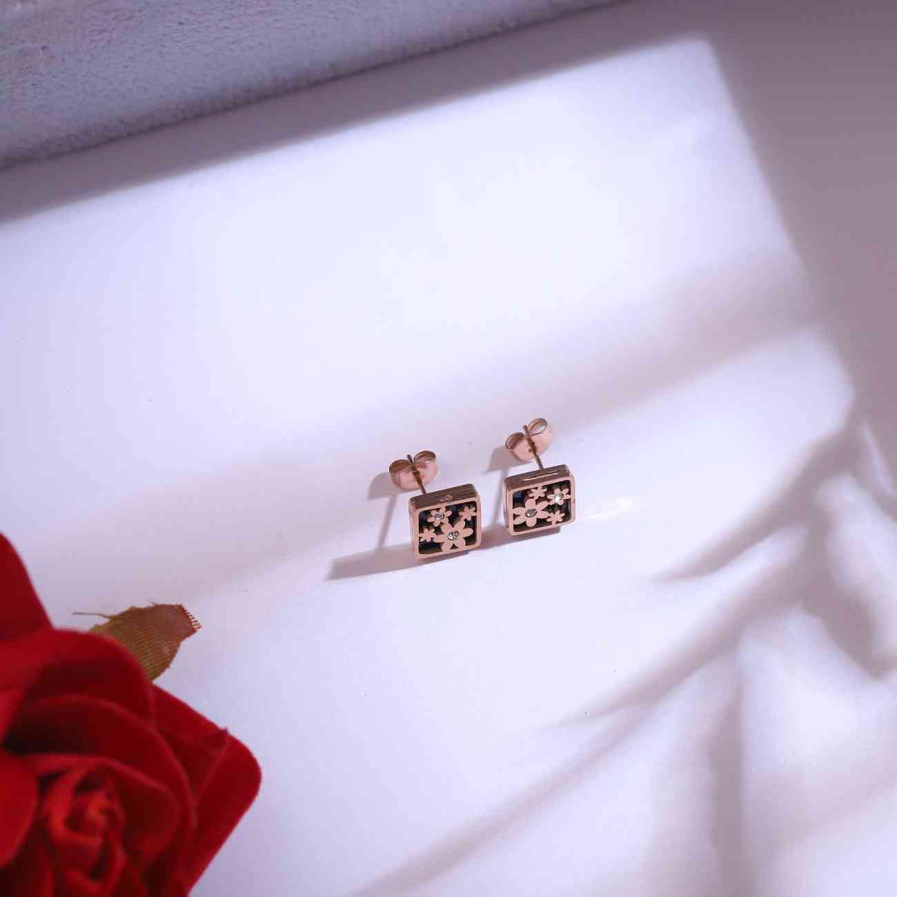 Add a graceful touch to your style with this Rose Gold Floral Pendant & Earrings Set. Designed with a sleek black enamel base and intricate floral cut-out detailing, the set includes a delicate pendant on a fine chain and matching stud earrings. Perfect for daily wear or special occasions, this timeless design brings elegance and sophistication to your jewelry collection.