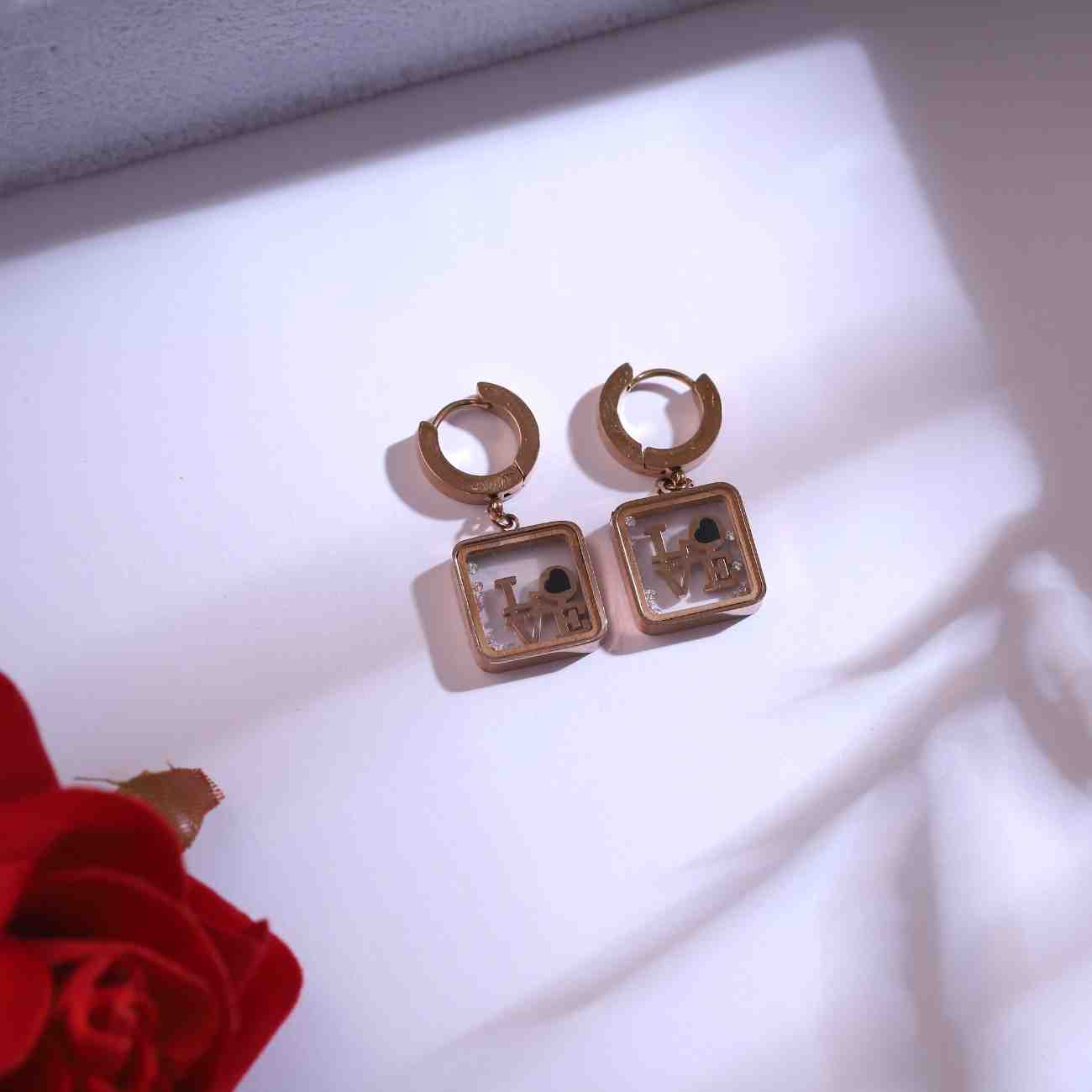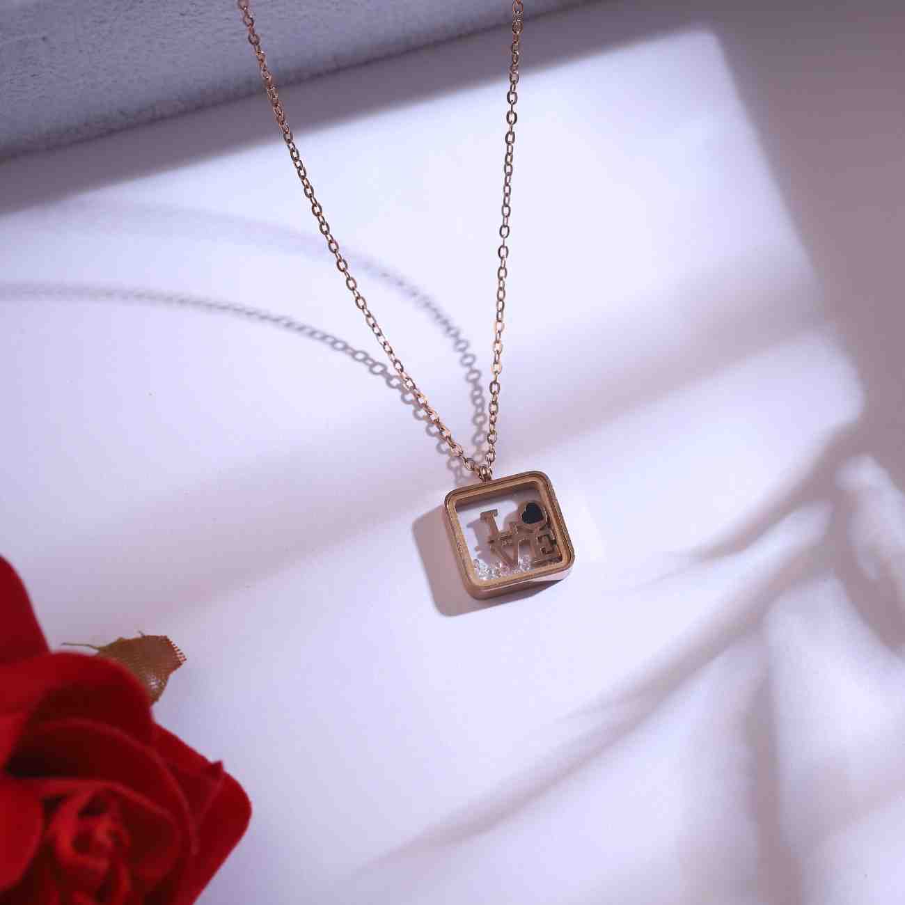 Celebrate elegance and affection with the Rose Gold Love Pendant & Earrings Set. This beautifully crafted set features a square frame design with a stylish “LOVE” motif, highlighted by a delicate black enamel heart. The pendant hangs gracefully from a fine chain, while the matching hoop earrings bring balance and charm. Perfect for gifting or personal wear, this set adds a modern romantic touch to any look.